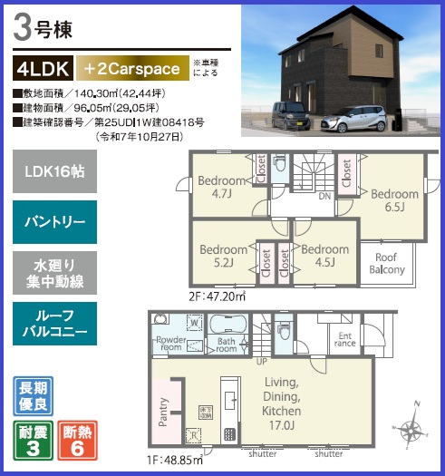 | 間取 | 4LDK+大型パントリー【3号棟】 | 用途地域 | 第一種低層住居専用地域 |